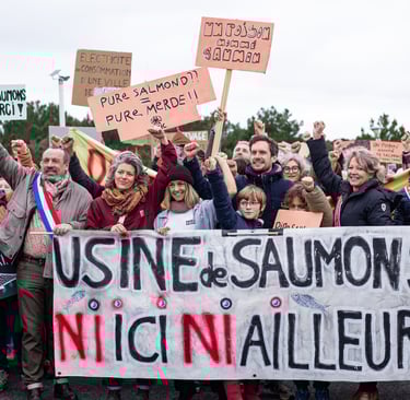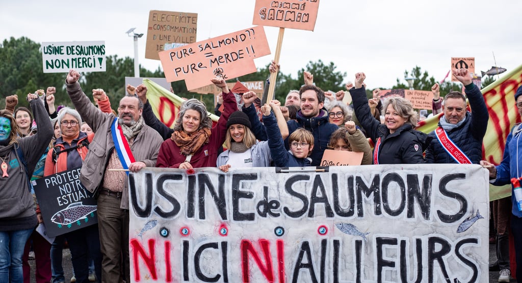 🎯 L’arrêt pur et simple du projet Pure Salmon, et des projets d'usines de saumons en France.